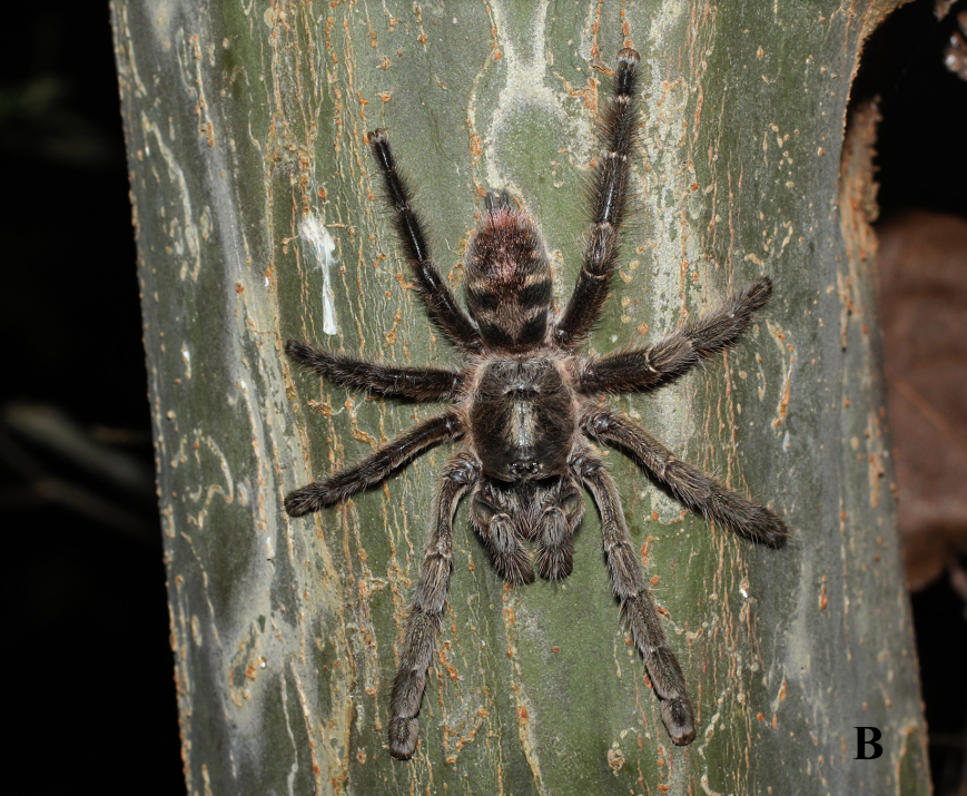 Zachowanie | Pająk nadrzewny, prowadzący głównie nocny tryb życia. Dzień spędza w kryjówkach budowanych w naturalnych zagłębieniach pni, konarach, wśród liści lub w szczelinach kory drzew. Kryjówki te tworzy z gęstej przędzy, którą wykorzystuje do budowy nieregularnych rurkowatych gniazd. Nie buduje klasycznych sieci łownych, lecz poluje aktywnie z zasadzki lub podczas krótkich patroli po najbliższym otoczeniu swojej pajęczyny. Ofiarę chwyta błyskawicznym skokiem, najczęściej z ukrycia, posługując się wrażliwością na drgania podłoża. Poluje głównie na drobne bezkręgowce, takie jak owady i inne stawonogi, jednak starsze i większe osobniki są w stanie upolować również niewielkie kręgowce, np. młode jaszczurki. W sytuacji zagrożenia unika konfrontacji, najpierw próbując ucieczki – często w górę lub do wnętrza pajęczyny. W przeciwieństwie do wielu naziemnych ptaszników rzadko wyczesuje włoski parzące, preferując zachowania unikowe. W skrajnych przypadkach może przyjąć postawę obronną lub ukąsić. Samce dojrzewają płciowo szybciej niż samice i po ostatniej wylince wyposażone są w narządy kopulacyjne – bulbusy – znajdujące się na końcach nogogłaszczek. Po odbyciu kopulacji samica, może złożyć kokon, zawierający od kilkudziesięciu do ponad stu jaj. Młode wykluwają się po kilku tygodniach i pozostają przez pewien czas w kokonie, gdzie przechodzą pierwszą wylinkę. Następnie opuszczają kokon i zaczynają samodzielne życie. | |