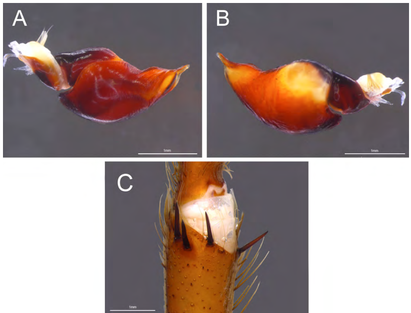 Ubarwienie | brak danych | brunatne z czerwonawymi włoskami na odnóżach i karapakasie, spód ciała jaśniejszy |